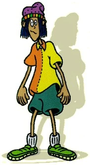Milo is a Pacific Islander preteen (like Pepper Ann and Nicky, he is 12 years old) with black hair (which reflects as a bold blue), which he wears a fuzzy, purple hat on. Said hat contains a three-color pattern on its rim - green, orange, and yellow. He wears a baggy T-shirt that is colored orange on one side, and yellow on the other; its collar is similarly split, with parallel colors f. Additionally, he wears turquoise shorts, white socks, and lime green sneakers.